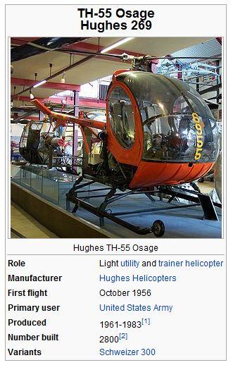 In 1958, prior to full-time production, Hughes provided five pre-production Model 269 examples to the U.S. Army for evaluation as a light observation helicopter to replace the aging OH-13 Sioux and OH-23 Raven. Designated as the YHO-2HU the helicopter was eventually turned down. 9 April 1959, the 269 received certification from the FAA and Hughes continued to concentrate on civil production. With some design changes, deliveries of the Model 269A version began in 1961. By mid-1963 about 20 aircraft were being produced a month and by the spring of 1964, 314 had been built.While the Army hadn't found the Model 269 adequate for combat missions, in 1964 it adopted the Model 269A as its training helicopter to replace the TH-23 and designated it the TH-55A Osage.792 TH-55 helicopters would be delivered by 1969, and it would remain in service as the Army's primary helicopter trainer until it was replaced in 1988 by the UH-1 Huey. At the time of its replacement, over 60,000 Army pilots had trained on TH-55 making it the Army's longest serving training helicopter.In addition to the US Army, Hughes delivered TH-55/269/300s to other military customers.In 1964, Hughes introduced the slightly larger three-seat Model 269B which it marketed as the Hughes 300. That same year, the Hughes 269 set an endurance record of 101 hours. To set the record, two pilots took turns piloting the aircraft and hovered in ground-effect for fueling. To ensure no cheating, eggs were affixed to the bottom of the skid gear to register any record-ending landing.
