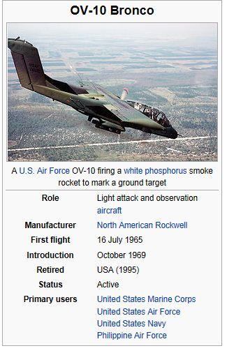 The U.S. Marine Corps OV-10 Night Observation Gunship System (NOGS) program modified two OV-10As to include a turreted forward-looking infrared (FLIR) sensor with a co-boresighted LASER Target Designator and turreted 20 mm (.79 in) M197 gun slaved to the FLIR aimpoint. The BuNo of the two converted were 155395 and 155396 (note-Wikipedia states four were modified; CAF has it on authority from a pilot, Jim Dearborn, who flew in Vietnam as part of a combat eval that two were converted). NOGS succeeded in Vietnam, but funds to convert more aircraft were not approved. NOGS evolved into the NOS OV-10D, which included a laser designator, but no gun.